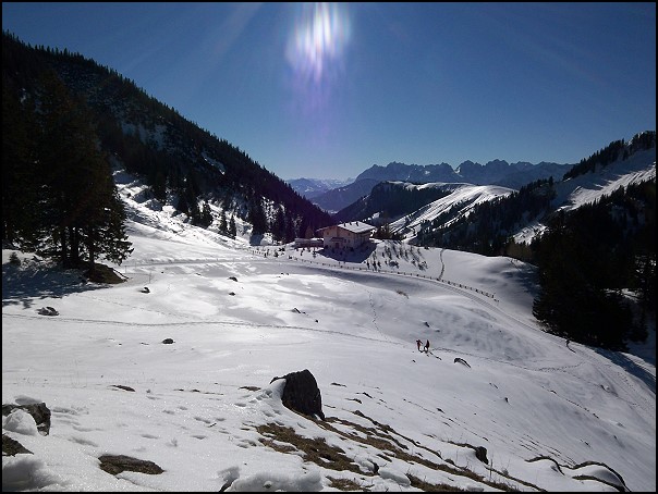 Unser Auto stellten wir in Sachrang (Huben) ab und von dort ging unsere Tour über die Westseite schließlich auch los. Die ersten paar Meter waren ziemlich schattig, aber nach gut zwanzig Minuten kamen wir in die Sonne hinein. Immer wieder boten sich uns wunderschöne Landschaftsbilder. Der Schnee glitzerte herrlich, was sich auf den Fotos aber leider nicht richtig einfangen ließ. Schade.