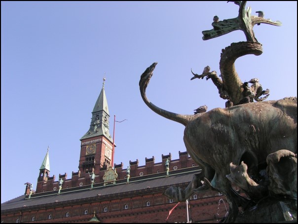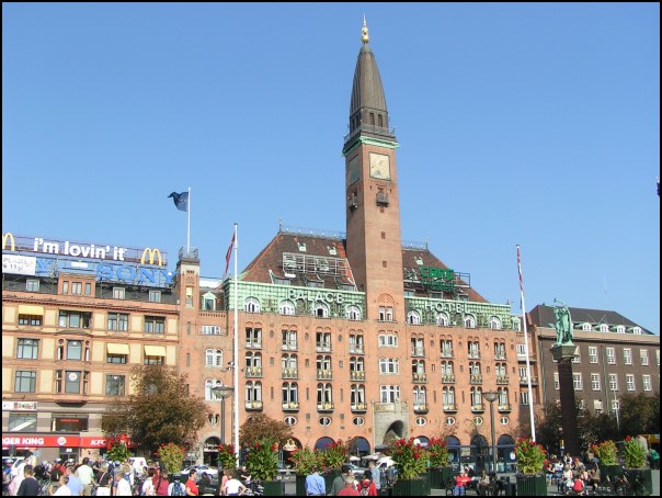 Vorbei am Rathaus, welches 1892 bis 1905 im Stilmix von nordischer Romantik und italienischer Renaissance erbaut wurde, und in einem verkehrsberuhigten Bereich auf einem Platz im Süden steht, erreichten wir die Fußgängerzone Kopenhagens.