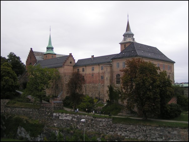 Die Akershus-Festung wurde 1299 bis 1319 von König Håkon V. Magnusson erbaut und in den darauffolgenden Jahren sehr oft belagert, eingenommen allerdings nur einmal und zwar im Zweiten Weltkrieg. Wir spazierten über das Festungsgelände und kamen an einigen Toren und Wassergräben vorbei. Das Innere der Festung besichtigen wir nicht. Nur wenige Schritte entfernt erreichten wir das Widerstandsmuseum, weiter hinten entdeckten wir die Schlosskirche.