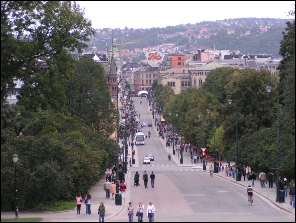 Wenn man vor dem Schloss steht und sich umdreht, hat man einen wunderschönen Blick auf die Karl Johans gate. Diese Flanier- und Einkaufsmeile zieht sich vom Schloss bis zum Bahnhofsgelände fast schnurgerade hin und es herrscht zu jeder Tageszeit reges Treiben. Hier befindet sich auch das sehr bekannte Grand Café – der Treffpunkt der ehemaligen Bohème, deren prominente Mitglieder dort auf einem großen Wandgemälde verewigt sind.