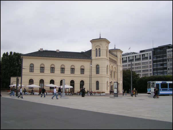Wir gingen die Cort Adelers Gate hoch und erreichten nach wenigen Minuten das Ibsen-Museet sowie das Nationaltheater, gleich dahinter erblickten wir das Kongelige Slot (Königliches Schloss). Es liegt in leicht erhöhter Lage und wurde 1825 – 1848 im klassizistischen Stil erbaut. Seit 1849 dient es allen norwegischen Monarchen als Winterresidenz. Leider ist das Schloss für Touristen nicht zugänglich, da es noch komplett als Wohnsitz genutzt wird. Dafür kann aber der sich dahinter erstreckende Schlosspark und Dronningparken besucht werden. Jeden Tag um 13.30 Uhr findet hier außerdem eine Wachablösung statt, die zahlreiche Touristen anzieht.