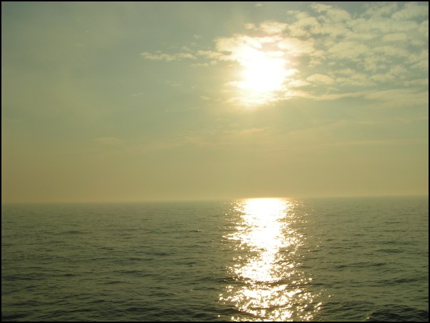 Den Nachmittag verbrachten wir mit Postkarten schreiben, Lesen und bei Kaffee & Kuchen. Gegen frühen Abend machte ich es mir noch ein wenig auf dem Seitendeck bequem und genoss den beginnenden herrlichen Sonnenuntergang sowie das Rauschen des Meers. Außer mir war sonst niemand mehr auf dem Seitendeck und genau diese Ruhe genoss ich so.
