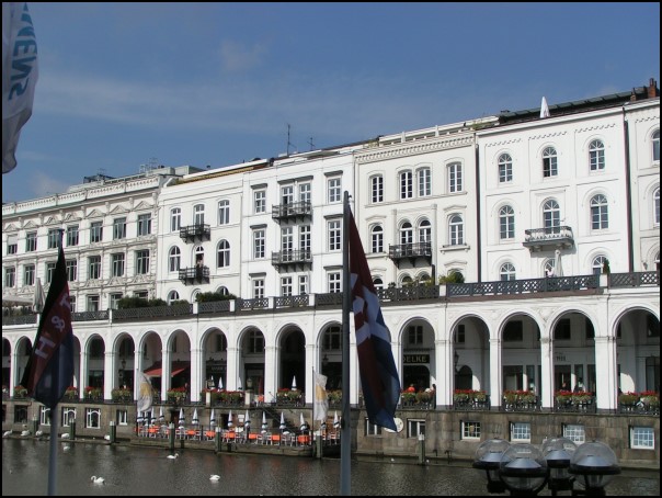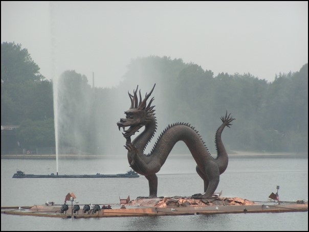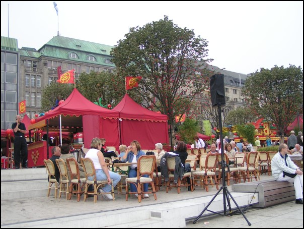 Wir spazierten die Fußgängerzone (Mönckebergstraße) entlang in Richtung des Rathauses und erreichten die Alsterarkaden. Dort setzten wir uns ein wenig auf die Bank und genossen die Stille. Weiter ging's schließlich vor zur Binnenalster, wo gerade ein chinesischer Markt aufgebaut war. Vom 13.09. bis 01.10.2006 fand in Hamburg die China Time 2006 statt. Grund für diese Veranstaltung war die Stärkung der geschäftlichen Beziehungen zwischen Hamburg und China. Als Rahmenprogramm waren ein chinesischer Markt, chinesisches Feuerwerk, Wirtschaftsgipfel und vieles mehr geboten. Inmitten der Binnenalster war ein riesiger chinesischer Drache zu sehen und in der Innenstadt traf man auf viele chinesische Figuren. Wir schlenderten durch den Markt hindurch und von überall her duftete es köstlich nach asiatischem Essen.