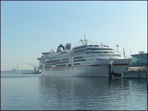 Mit ein wenig Verspätung lief zuerst die Hapag Lloyd Europa ein, dicht gefolgt von der AIDAblu. Beide schön eingehüllt in das herrliche Morgenrot Kiels.