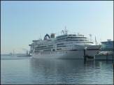 Zum Frühstücken war es allerdings noch zu früh und so legte ich mich nochmals ein wenig hin, als es um 8 Uhr endgültig Zeit war. Sogar vom Bett aus konnten wir die AIDAblu erkennen. Wie praktisch ...